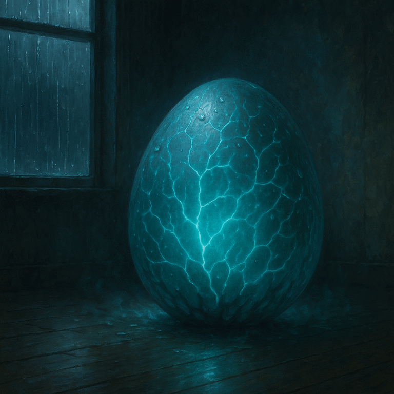 夕立の後、川沿いを歩いていたら、奇妙な光を放つ石のようなものを見つけた。拾い上げると、石ではなく卵らしかった。手のひらよりも少し大きく、青白く脈打つように光っている。