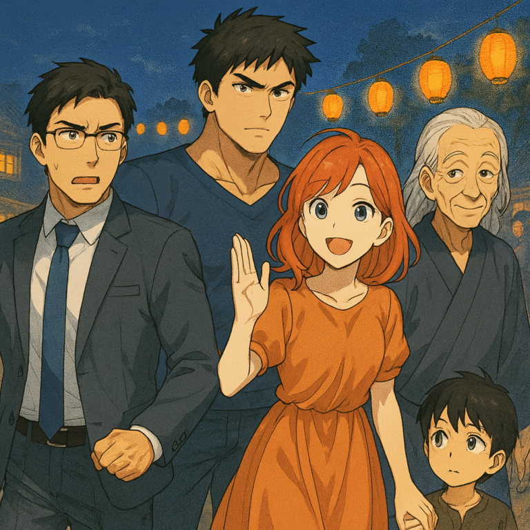 その瞬間、皿の上の刺身が光を放ち、するすると形を変えた。切り身が人の姿へと伸び、マグロは逞しい青年に、サーモンは派手で陽気そうな女に、イカは細身の老人に、ヒラメは無表情な子供に変わった。