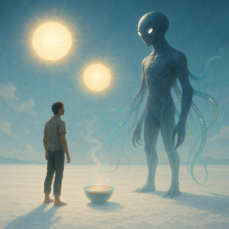 目を開くと、そこは真っ白な大地。空には三つの太陽が昇り、影が三方向に伸びている。耳に聞こえるのは、風とも音楽ともつかぬ柔らかな旋律。そして目の前には、光る触手を持つ巨大な存在が立っていた。