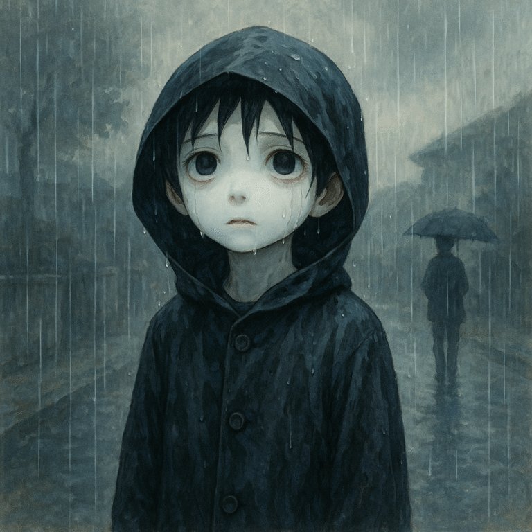覗き窓から見ると、見知らぬ少年が立っていた。青白い肌に黒い雨合羽を着て、髪からは水滴がしたたり落ちている。