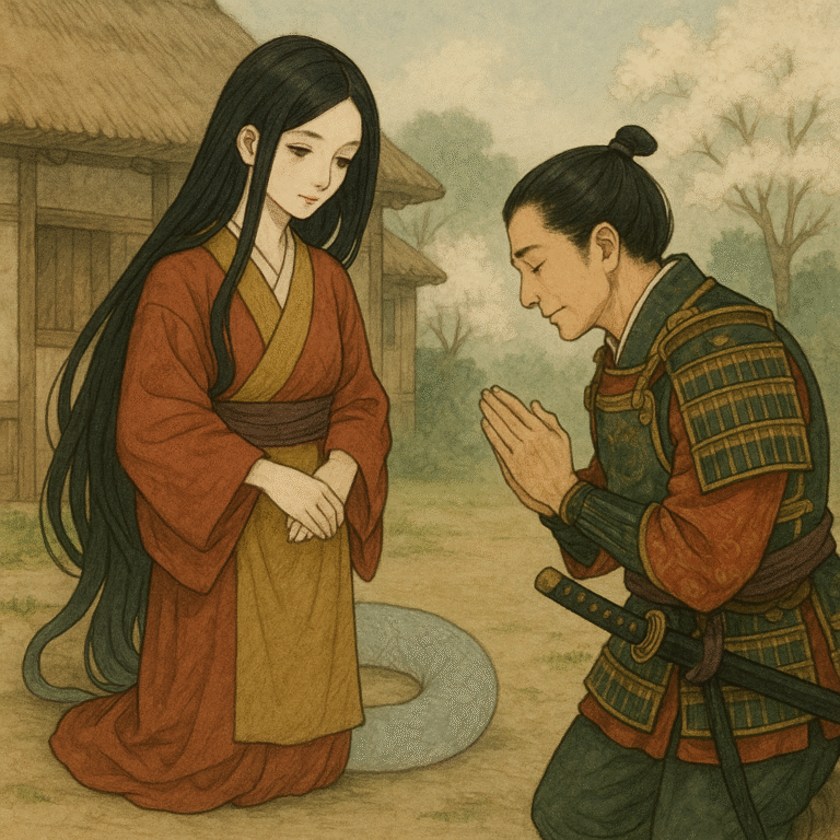 「命は取らぬ。だが約束をせよ。おぬしの妻が産む子は、醜き娘となる。下半身は蛇、顔は二目と見られぬ醜さよ。それでも愛し、大切に育てるならば、命を助けてやろう」