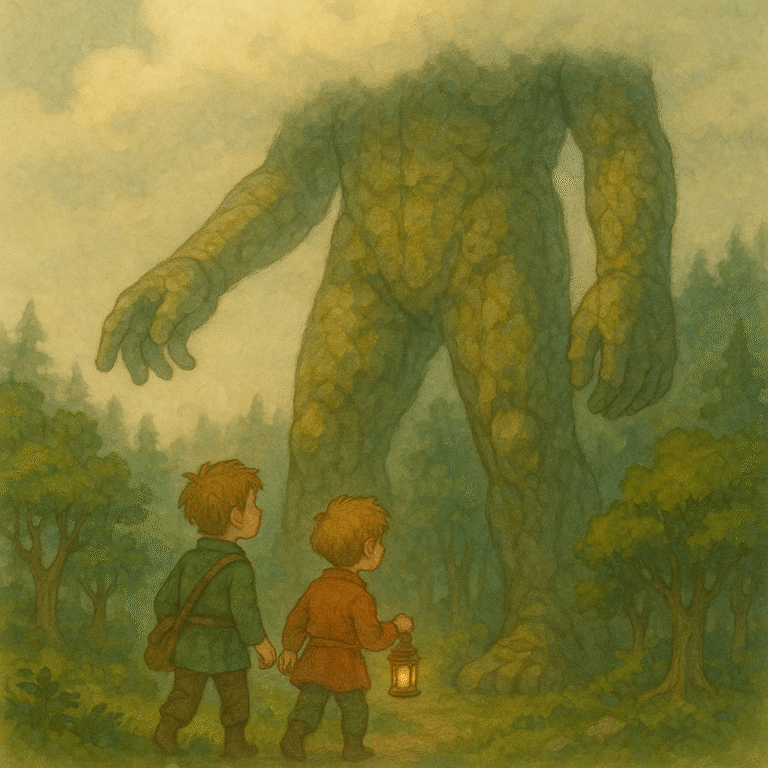 遠くで雷が鳴り、雨が降り始める。巨人は動きを止め、再び静かになった。目の光は消え、森は元通りの静けさを取り戻した。