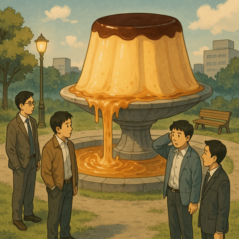振り返ると、公園の噴水が巨大なプリンになっていた。水のかわりにカラメルがとろとろ流れている。