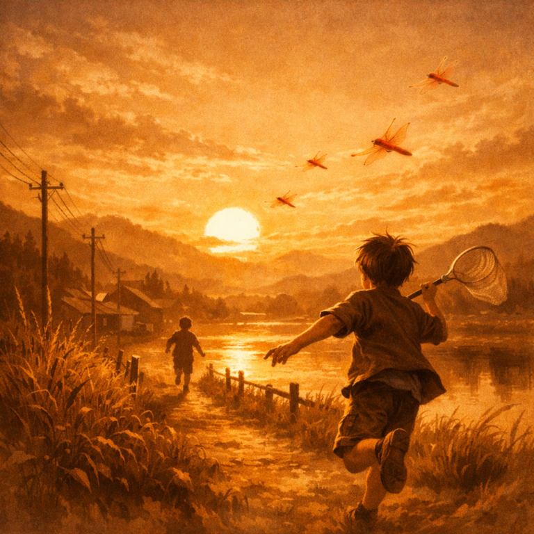 私は見知らぬ少年と一緒に、真っ赤なトンボを追いかけている。少年の顔は逆光で見えないが、その笑い声には聞き覚えがあった。それは、私が大人になる過程で、どこかに置き去りにしてきた何かの記憶。