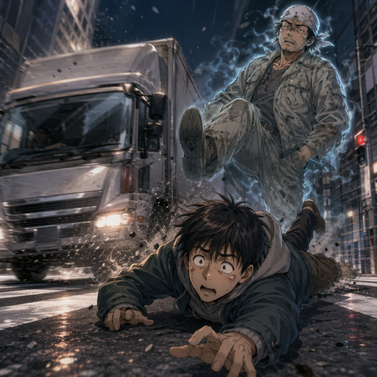 無様に前へ転がった瞬間、俺の目の前を、ハンドルを切り損なったらしいトラックが突っ切っていった。腹の立つことに、歩道に乗り上げていながらも、トラックはスピードを落とすことなくそのまま走り去っていった。